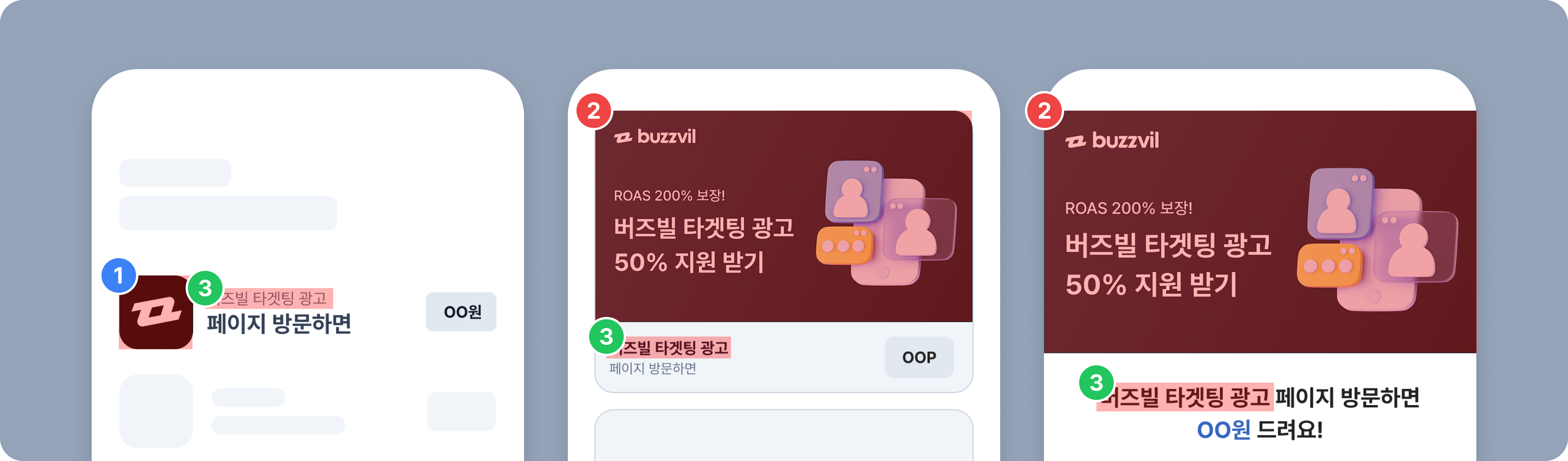 <table data-header-hidden><thead><tr><th width="211.00390625"></th><th width="134.9140625"></th><th width="418.46484375"></th></tr></thead><tbody><tr><td>항목</td><td>형태</td><td>사양</td></tr><tr><td>① 브랜드 로고 🔵</td><td>이미지</td><td>1200 × 627px / JPG, PNG / 2MB 이하</td></tr><tr><td>② 소재 배너 🔴</td><td>이미지</td><td>320 × 320px / JPG, PNG / 2MB 이하</td></tr><tr><td>③ 타이틀 🟢</td><td>텍스트</td><td>띄어쓰기 포함 15자 이하</td></tr><tr><td>④ 설명</td><td>텍스트</td><td>띄어쓰기 포함 40자 이하</td></tr><tr><td>⑤ 랜딩 URL</td><td>링크</td><td><code>utm_source=buzzvil</code> 파라미터 포함</td></tr></tbody></table>